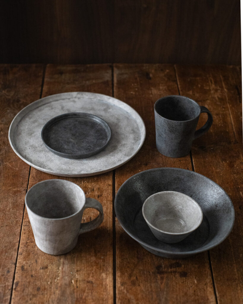 灰雪と黒瓦手のマグカップやフラットプレートなどを納品しました。